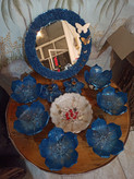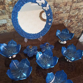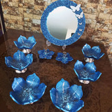 ست هفت سین به رنگ ابی حاوی شش عدد پیاله پایه دار دو عدد جاشمعی پایه دار ویه اینه سی سانتی تزیین با سنگ ورزین وطرح نگار پروانه بسیار شیک خوشرنگ دلچسب وبادوام درصورت اتمام موجودی حداکثر در سه روزی کاری اماده میشود