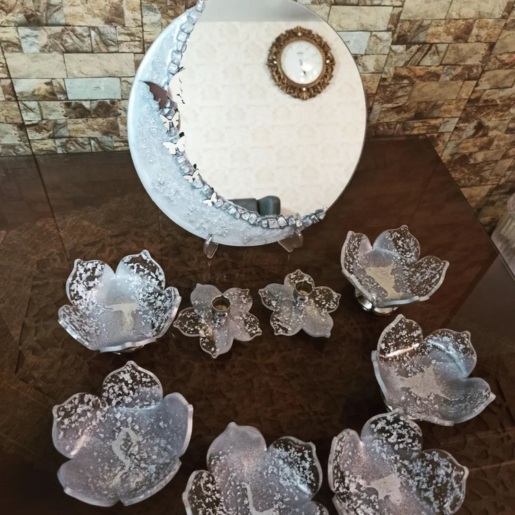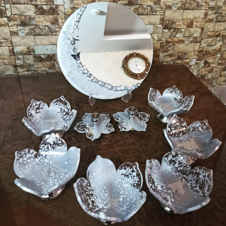 ست نقره ای هفت سین حاوی ۶ عدد پیاله سایز۱۵ سانت وپایه دار دوعدد جاشمعی پایه دار واینه ۳۰ سانتی کارشده با سنگ ورزین میباشد